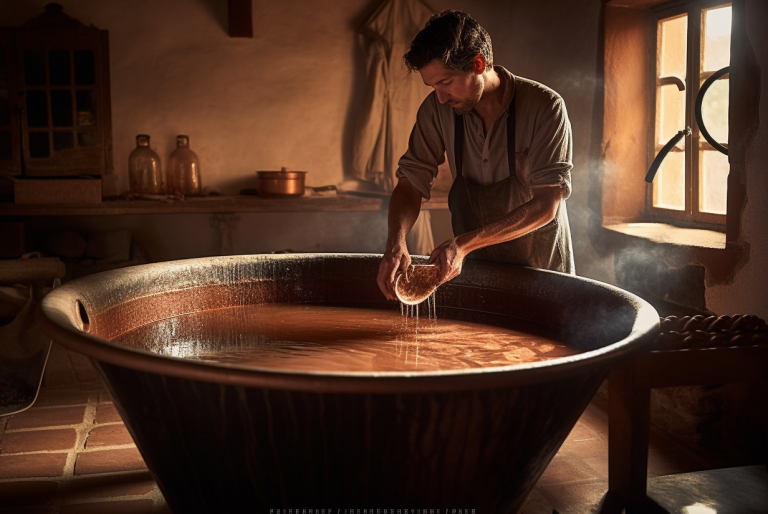 Les étoffes brutes passent ensuite par les mains expertes des maîtres teinturiers provençaux. Ici, les bains de couleur sont réalisés à la petite cuve, à feu doux, avec des pigments soigneusement dosés pour préserver l’éclat et la tenue dans le temps. Chaque nuance est éprouvée sur place : un noir profond, un blanc cassé délicat, un or sombre… L’opération exige humilité et sensibilité ; elle forge le caractère discret et audacieux de nos futures pièces.
